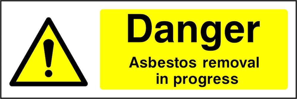 Sign text: Danger: Asbestos removal in progress.