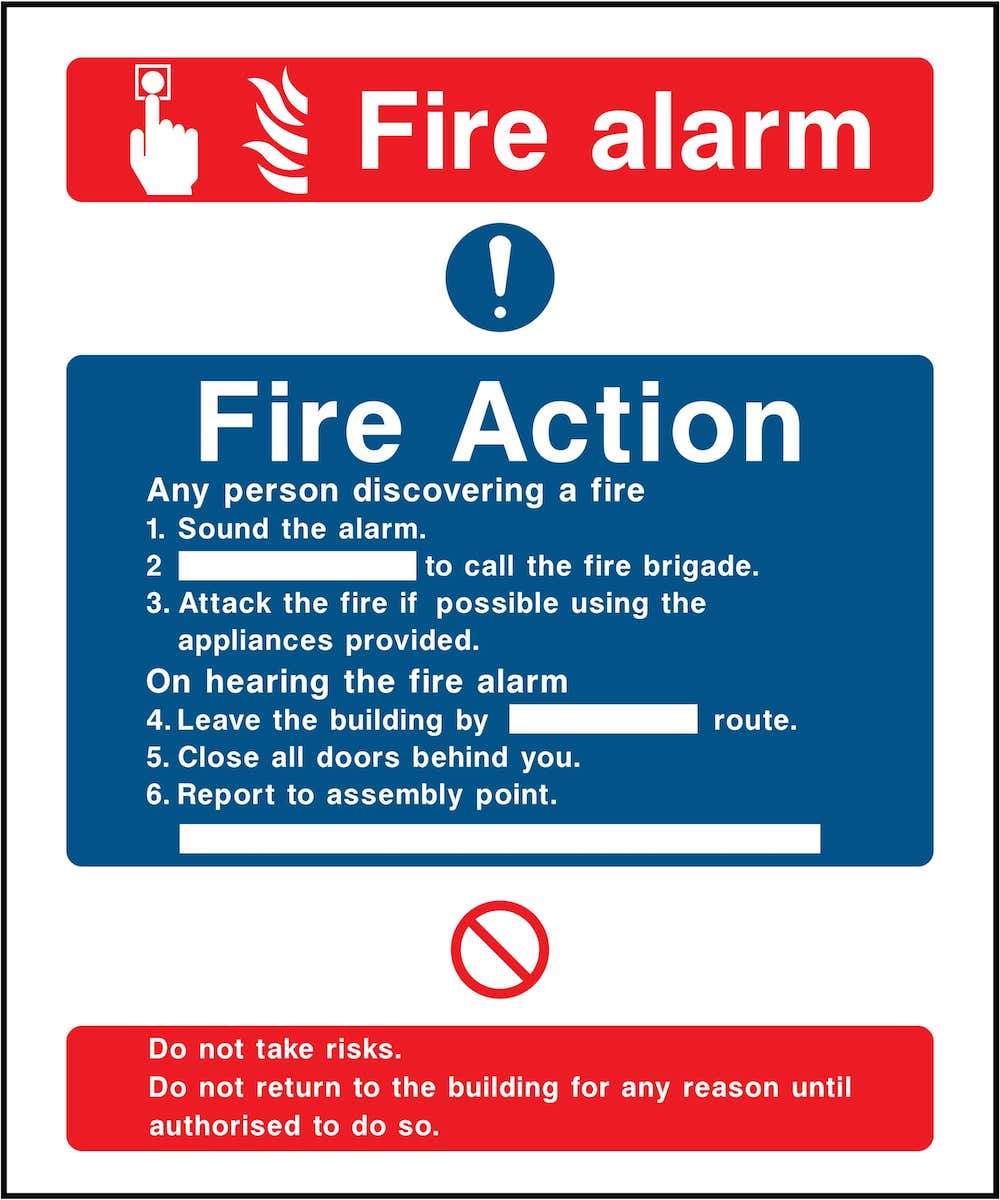 Make sure your workforce, and site visitors, are able to understand the actions to take in the event of discovering a fire. This fire action notice contains six points with images and should be placed next to fire alarms.