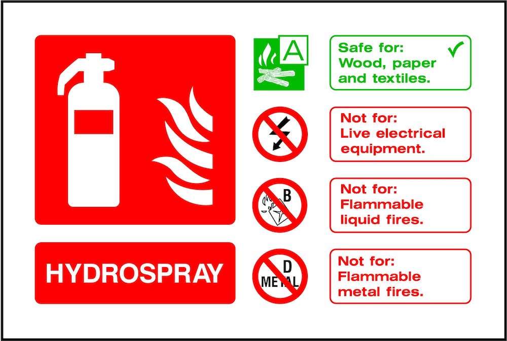 Sign text: Hydrospray (and on which fire types it's safe to use).