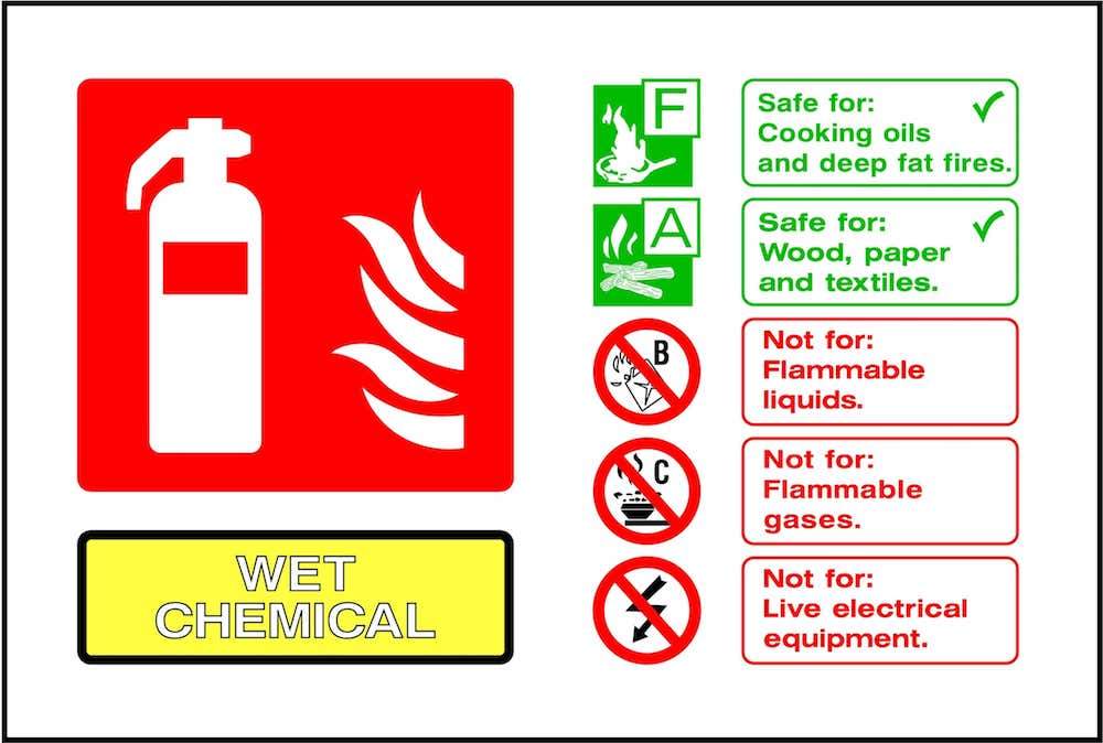 Sign text: Wet chemical (and on which fire types it's safe to use).