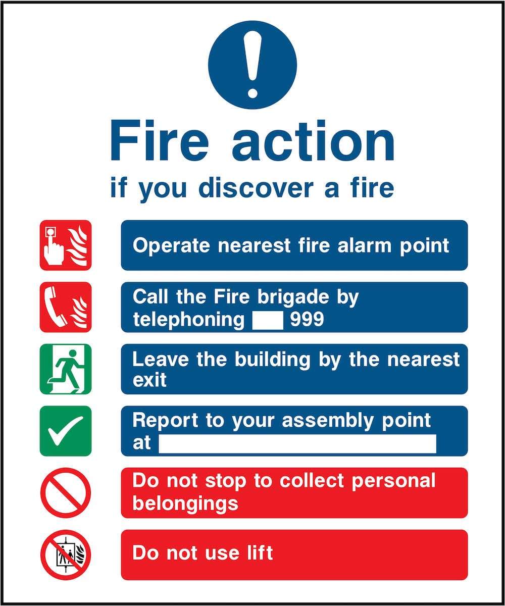 Make sure your workforce, and site visitors, are able to understand the actions to take in the event of discovering a fire. This fire action notice contains six points with images, including an editable fire brigade phone number.