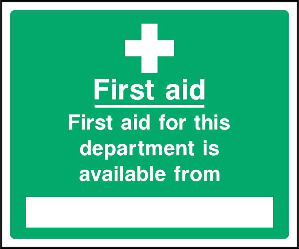 This editable, first aid sign makes sure that all stakeholders are aware of the location of first aid for a department.