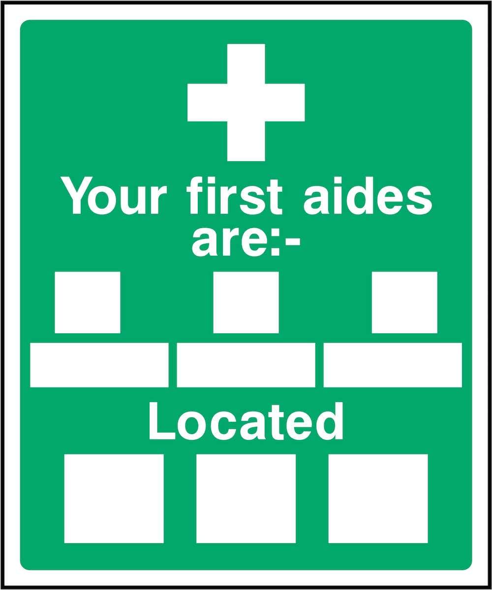 This green and white sign makes sure that all stakeholders are aware of who the first aides are and their locations.