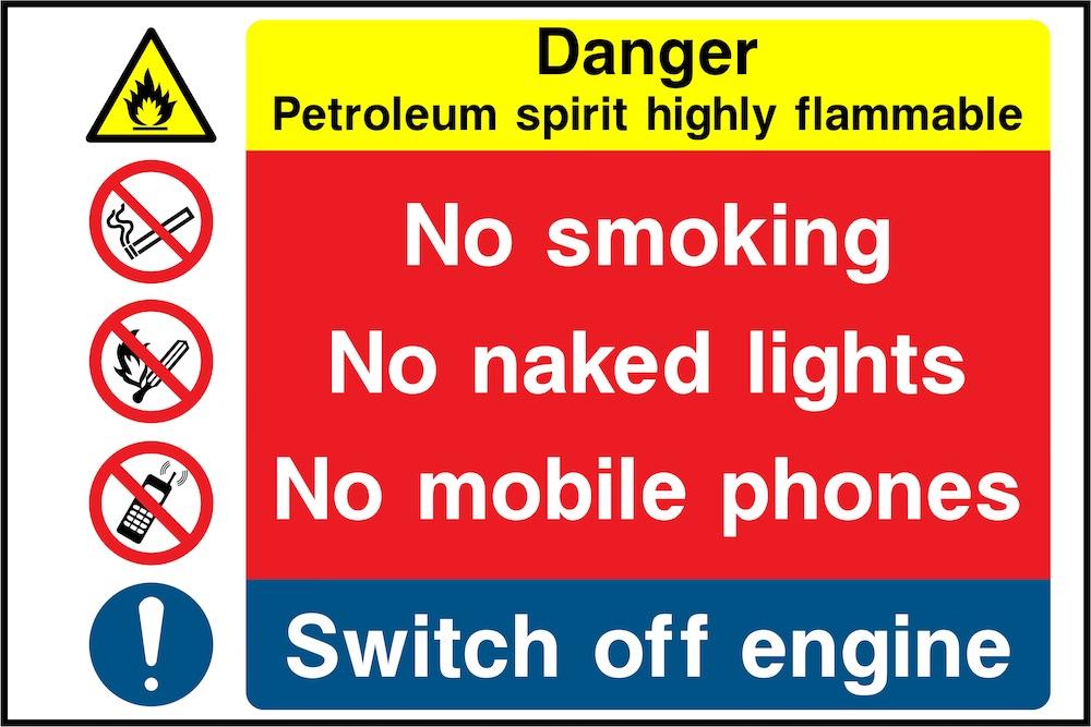 Sign text: Danger: Petroleum spirit, highly flammable - No smoking - No naked lights - No mobile phones - Switch off engine.