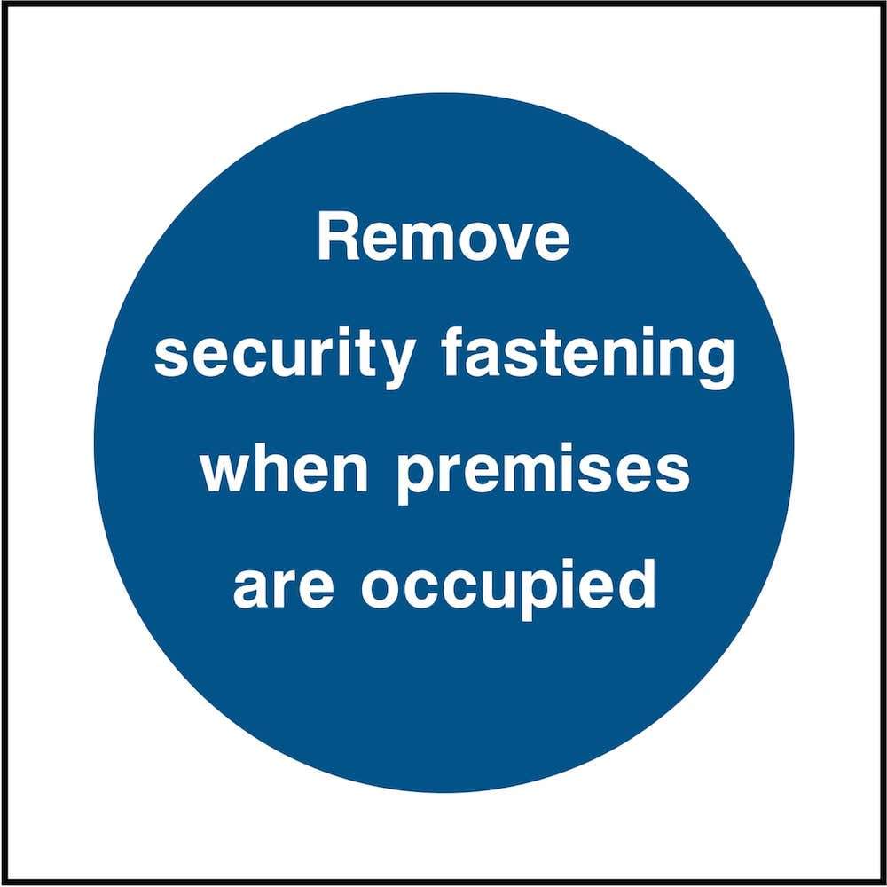 Implement best safety sign practices in order to ensure your workforce, and any visitors, are able to exit premises quickly, in the event of an emergency. This fire safety sign will make sure security fastenings are removed from an emergency exit door whilst occupants are working.