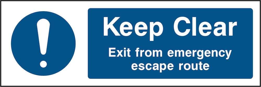 Sign text: Keep clear: Area from emergency escape route.