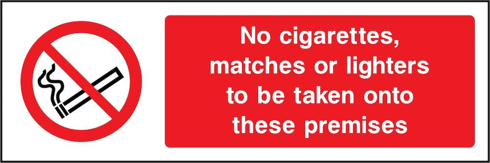 Sign text: No cigarettes, matches or lighters to be taken onto these premises.