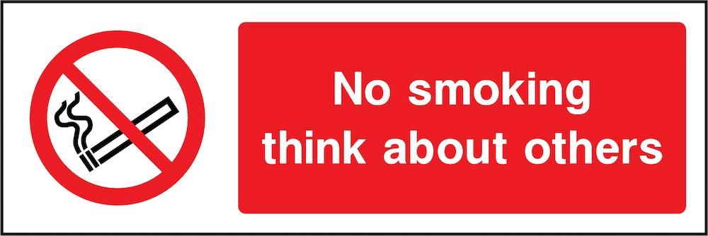 This red and white, no smoking sign reminds employees, customers, and visitors that they are not to smoke on the premises, and they should think about the impact they're having on other people's health.