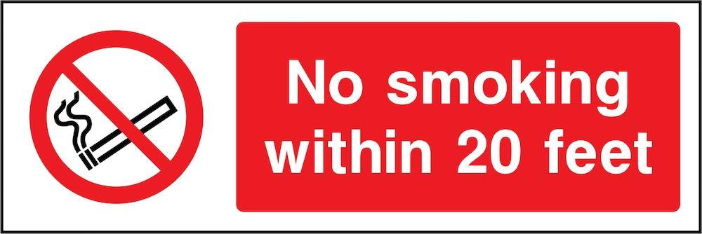 This red and white, smoking sign reminds employees, customers, and visitors that they are not to smoke within 20 feet of the sign's location.