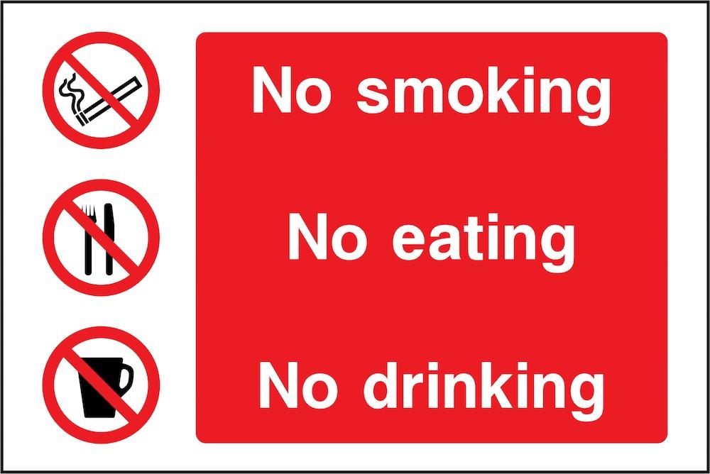 This red and white, prohibition sign reminds employees, customers, and visitors that smoking, eating, and drinking is not permitted in the immediate area.
