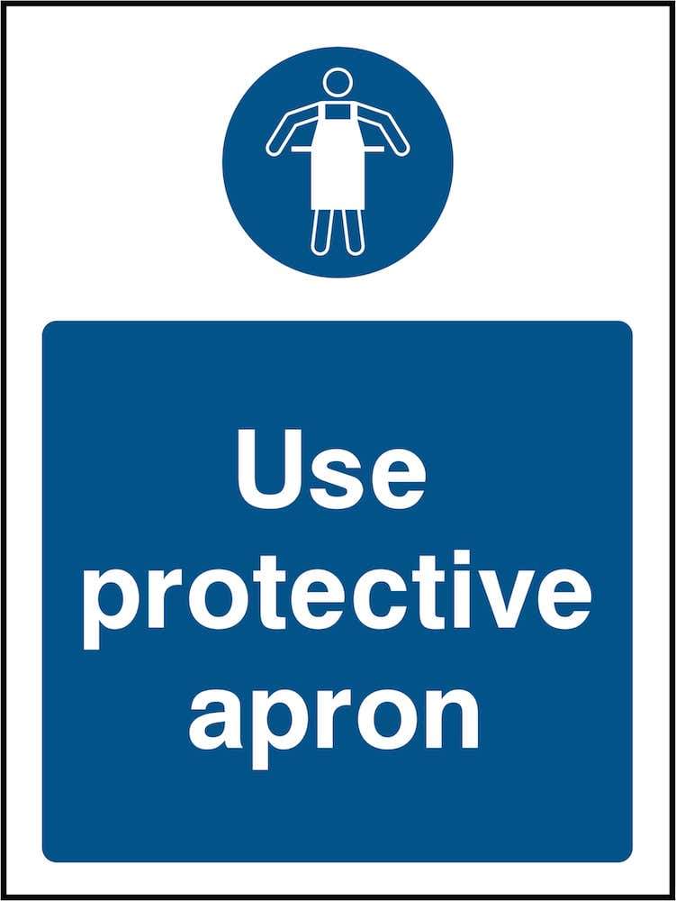 This mandatory PPE sign, with an image, makes sure that all stakeholders are aware that protective aprons must be used, to protect from potential hazards.