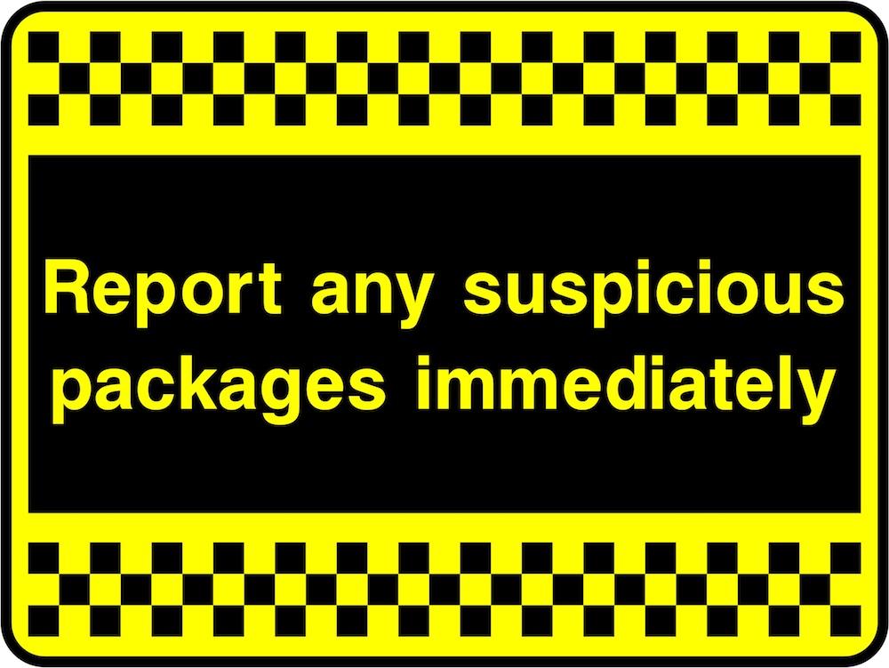 Make sure your premises remain as secure as possible by installing clear security signs. This chequered, security sign makes sure that all people in the area are aware that, if they observe any suspicious packages, to report these immediately.