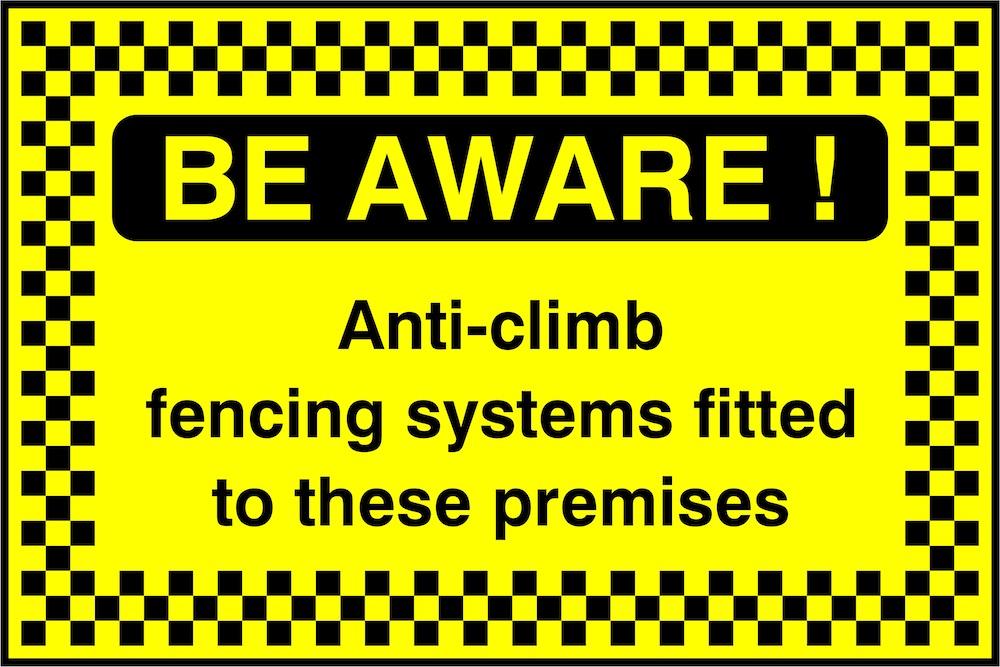 Sign text: Be aware! Anti-climb fencing system fitted to these premises.