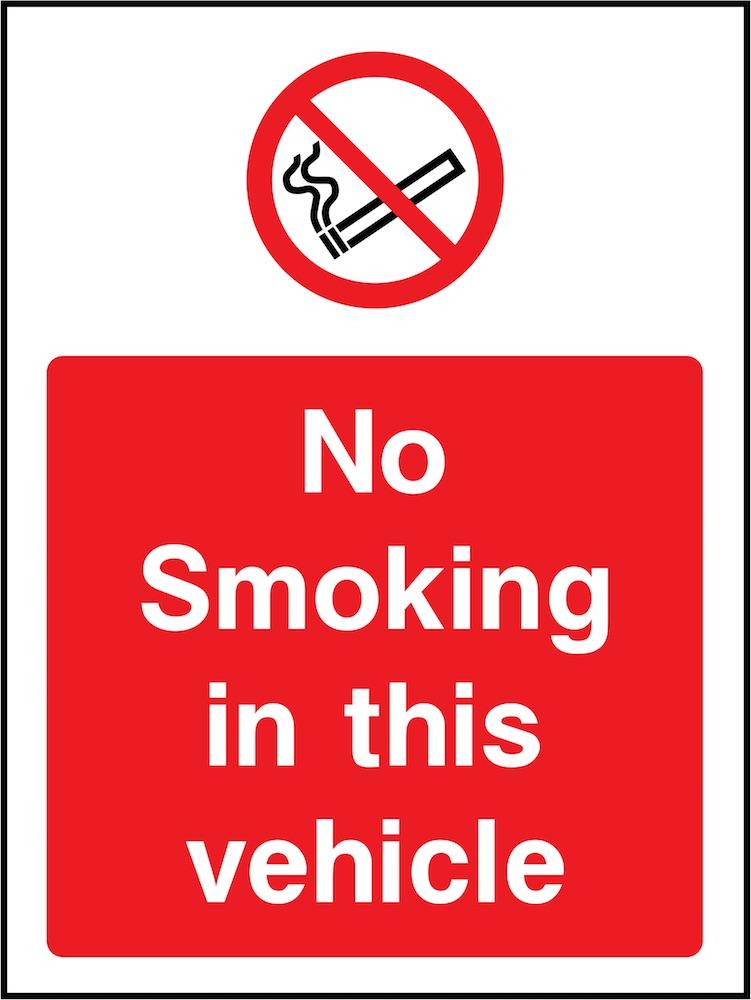 This red and white, no-smoking sign informs employees, customers, and visitors, that smoking is not permitted, whilst in a vehicle.