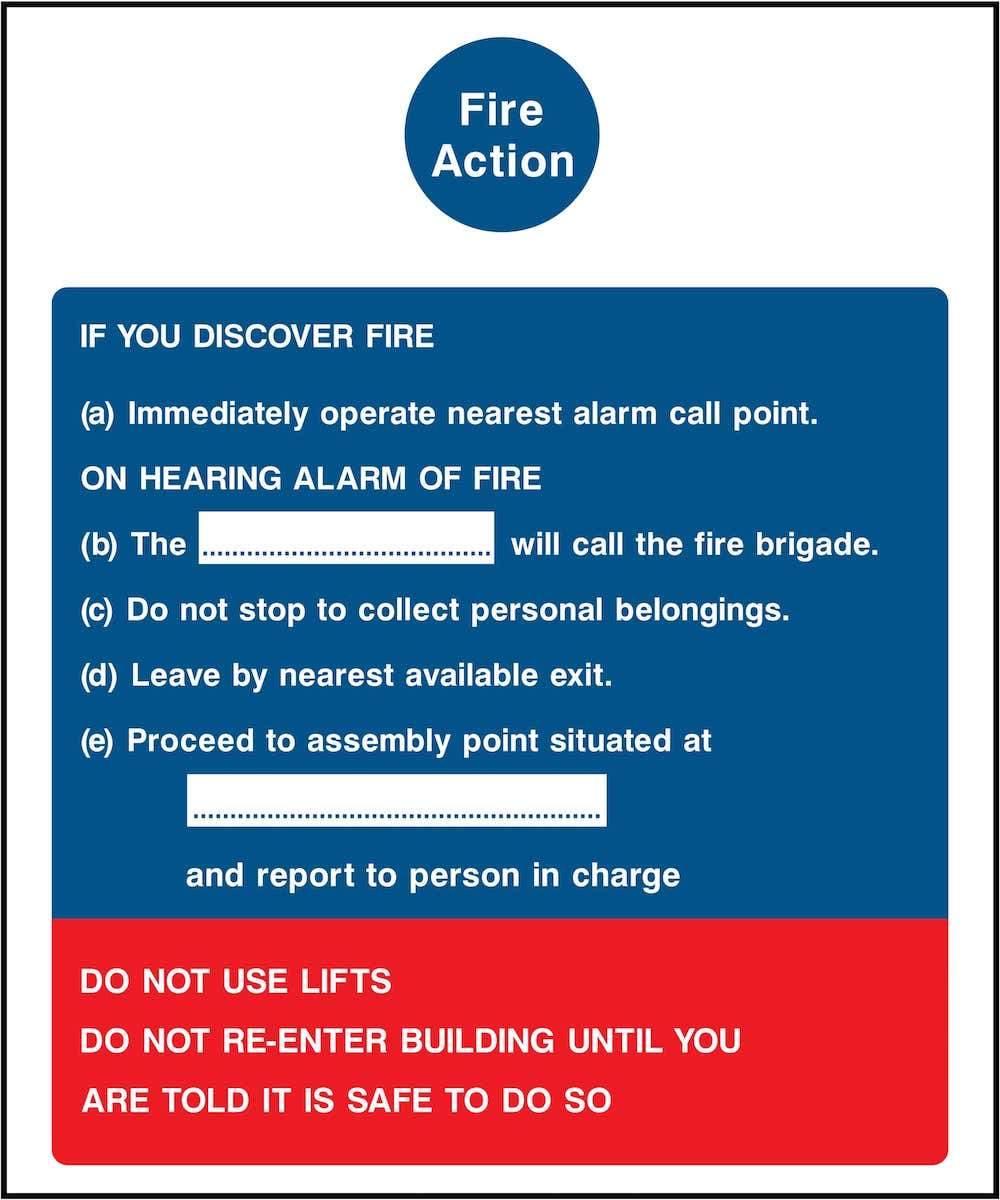 Make sure your workforce, and site visitors, are able to understand the actions to take in the event of discovering a fire. This fire action notice contains five points, including the ability to edit the responsibility of calling the fire brigade.