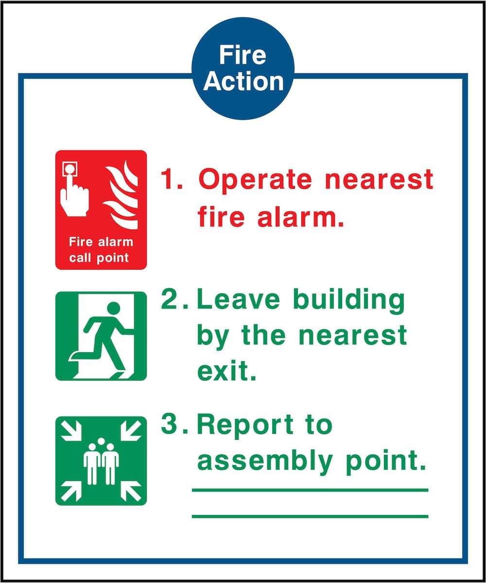Make sure your workforce, and site visitors, are able to understand the actions to take in the event of discovering a fire. This simple fire action notice contains three points with images, including an editable assembly point location.
